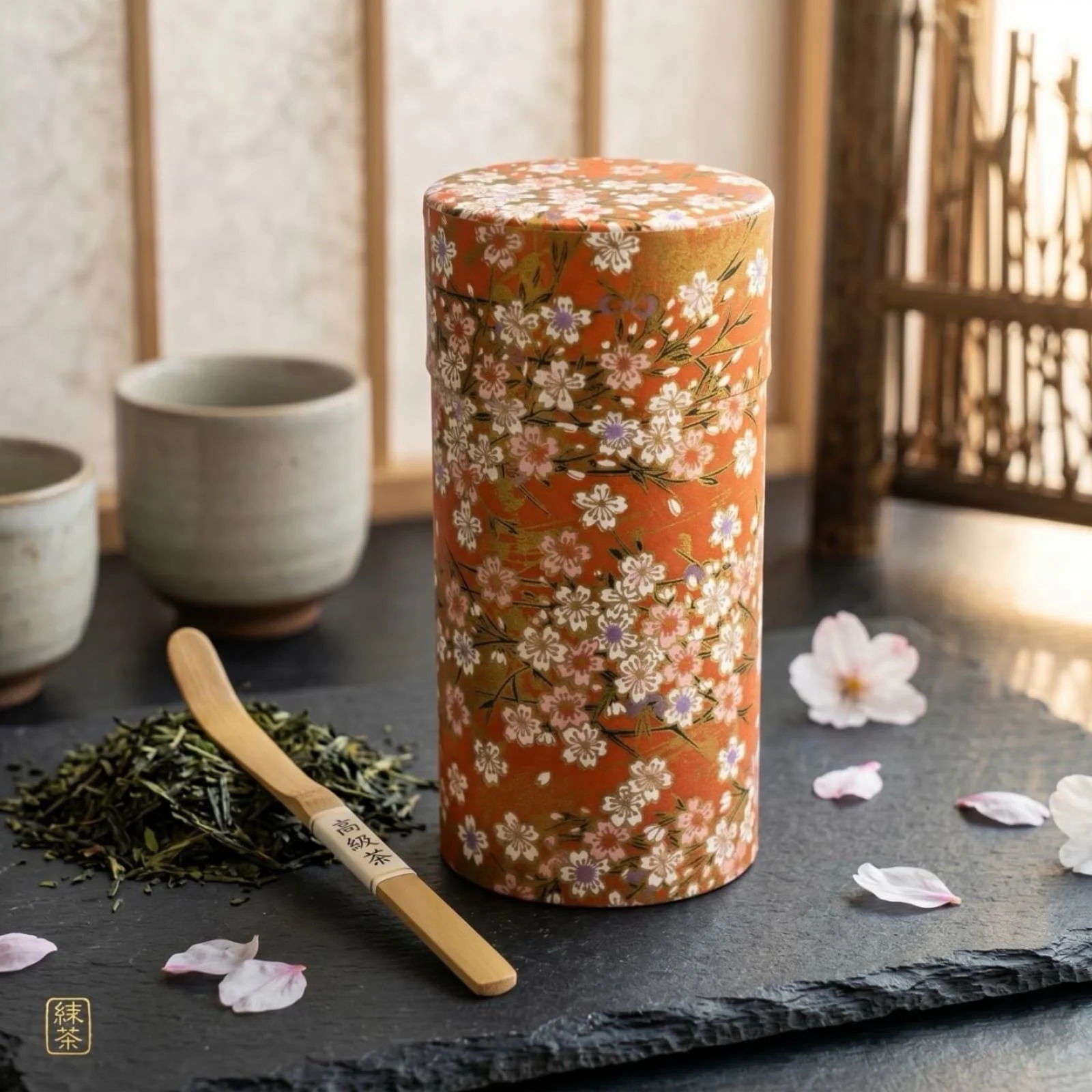 Estetika, įkvėpta Japonijos „Kazuko“ dėžutė arbatai – tai ne tik talpykla, bet ir išskirtinė virtuvės interjero detalė. Jos išorė kruopščiai padengta plonu japonišku Washi popieriumi. Subtilus vyšnių žiedų raštas, susiliejantis su oranžiniais ir rausvais fono atspalviais bei aukso detalėmis, sukuria itin harmoningą ir prabangų vaizdą.