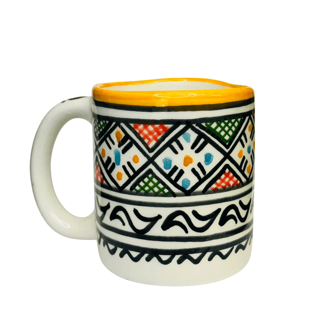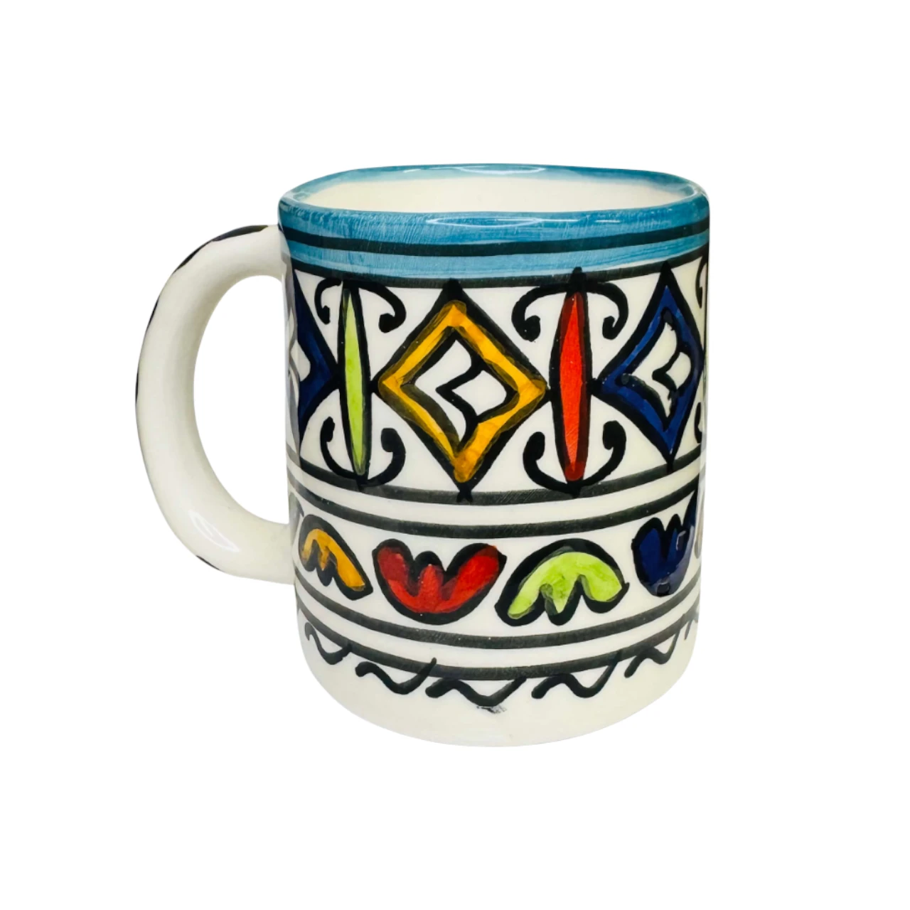 • Autentiškas keramikinis puodelis iš Maroko (Cilindras L): Tai ne šiaip indas, o unikalus meno kūrinys. Kiekvienas puodelis yra žiestas ir tapytas rankomis Maroko meistrų, todėl antro identiško nerasite. Ryškūs raštai ir tradicinė keramika suteiks Jūsų arbatos ritualui rytietiško žavesio ir šilumos.
