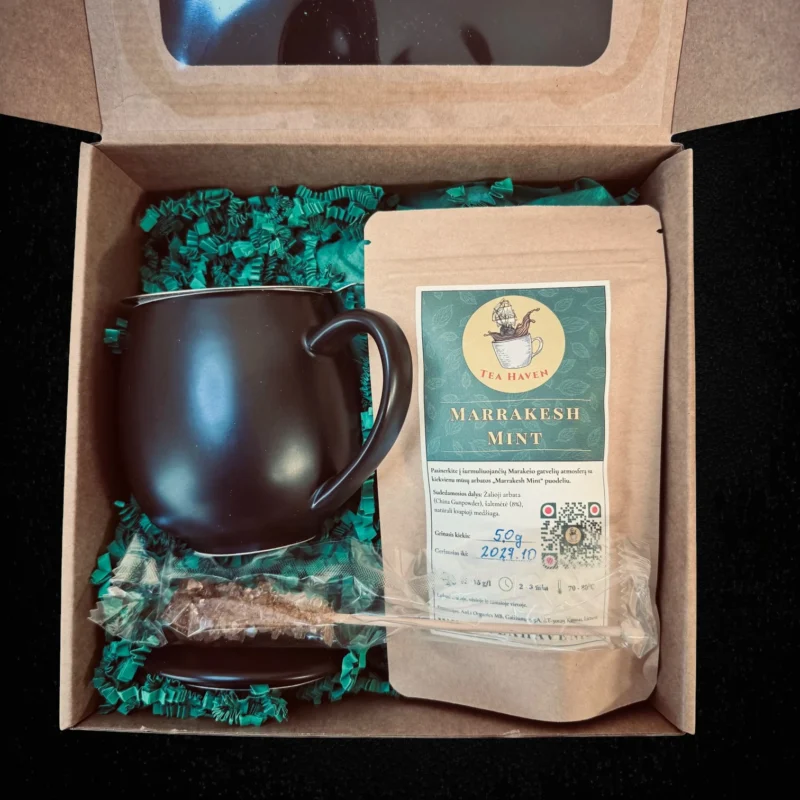 Padovanokite jaukumo ir šilumos akimirką. Mūsų kruopščiai atrinktas dovanų rinkinys su arbata (Marrakesh Mint) ir puodeliu sukurtas tam, kad džiugintų ne tik savo turiniu, bet ir estetiniu pateikimu. Tai universali dovana, kuri tiks gimtadieniui, Kalėdoms ar tiesiog norint parodyti dėmesį.
