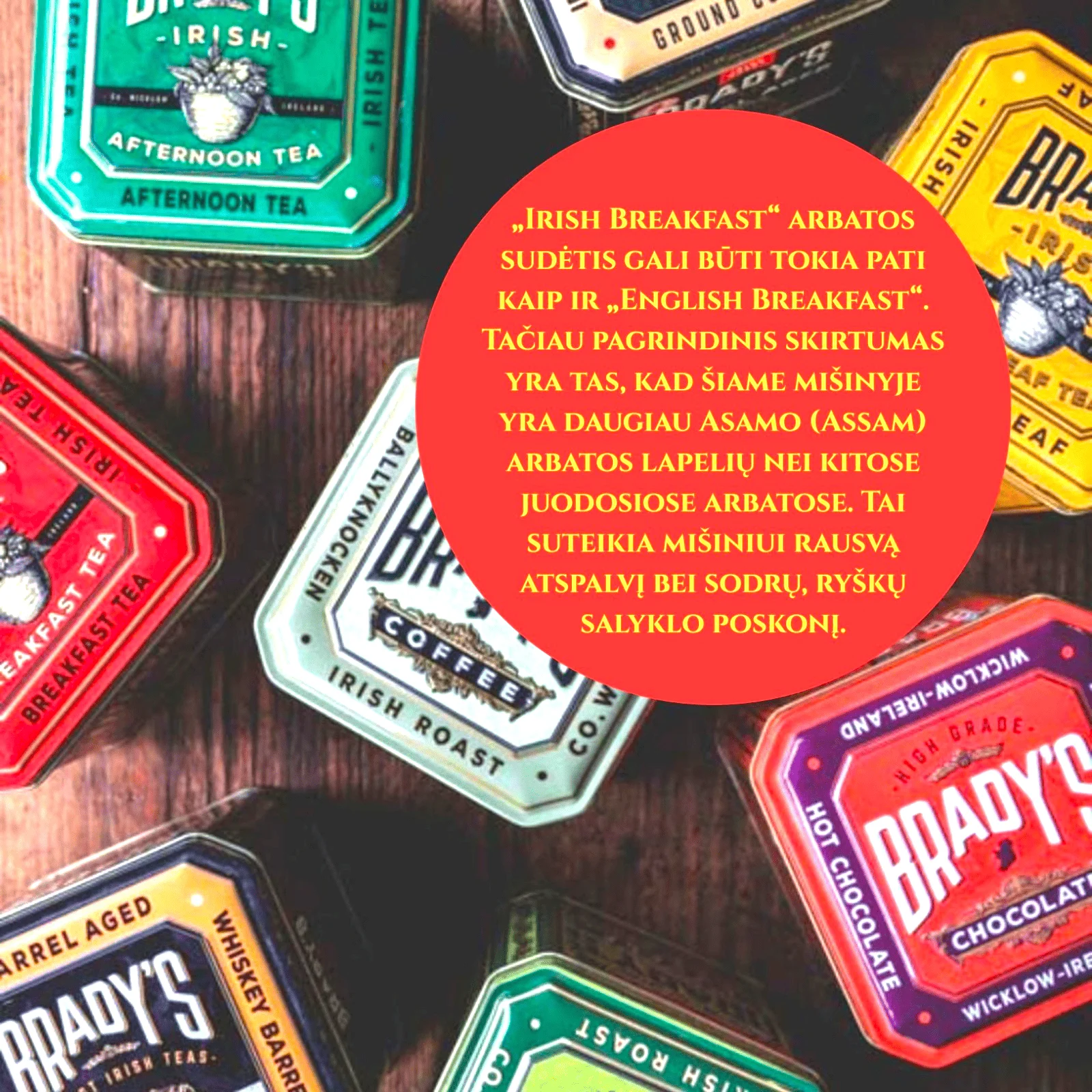 Airiškų pusryčių paslaptis Pasaulis žino anglų pusryčių arbatą, tačiau airiška tradicija slepia kai ką stipresnio. Brady’s Irish Breakfast išsiskiria savo sudėtimi: į šį mišinį įeina gerokai daugiau Assam arbatos lapelių. Būtent jie suteikia arbatai tą garsųjį airišką sodrumą ir šildantį, salyklišką poskonį, kurio neįmanoma supainioti su niekuo kitu.