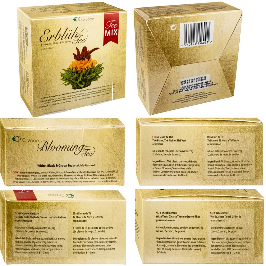 Žydinti arbata dovana „Creano Mix“ Rinkinys supakuotas į paprastą, bet stilingą aukso spalvos kartoninę dėžutę. Tai puikus pasirinkimas ieškantiems neįpareigojančios, tačiau „wow“ efektą sukuriančios dovanos kolegoms, draugams ar artimiesiems.